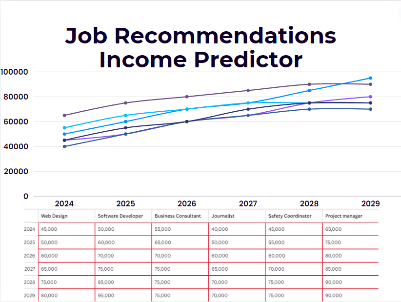 Go check out and explore our job income predictor which can predict the income of which ever job you choose for the next decade.